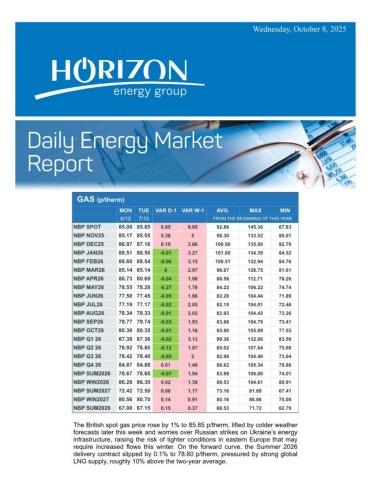 Wednesday, October 8, 2025GAS (p/therm) MONTUEVAR D-1 VAR W-1AVG.MAXMIN 6/107/10FROM THE BEGINNING OF THIS YEARNBP SPOT85.00 85.850.859.8592.86145.3067.83NBP NOV2585.17 85.550.38598.30133.5280.01NBP DEC2586.97 87.160.193.66100.50135.0082.79NBP JAN2688.51 88.50-0.013.27101.00134.3984.52NBP FEB2688.60 88.54-0.063.15100.51132.9484.76NBP MAR2685.14 85.1402.9796.67128.7581.61NBP APR2680.73 80.69-0.041.9888.58112.7178.26NBP MAY2678.55 78.28-0.271.7884.22106.2274.74NBP JUN2677.50 77.45-0.051.8682.28104.4471.89NBP JUL2677.19 77.17-0.022.0582.15104.0172.46NBP AUG2678.34 78.33-0.012.0282.93104.4273.26NBP SEP2679.77 79.74-0.031.9383.88104.7973.41NBP OCT2680.36 80.35-0.011.1685.80105.0977.53NBP Q1 2687.38 87.36-0.023.1399.36132.0083.59NBP Q2 2678.92 78.80-0.121.8785.02107.6475.00NBP Q3 2678.42 78.40-0.02282.98104.4073.04NBP Q4 2684.87 84.880.011.4688.62105.3479.86NBP SUM202678.67 78.60-0.071.9483.99106.0074.01NBP WIN202686.28 86.300.021.3989.53104.6180.91NBP SUM202772.42 72.500.081.1773.1681.8967.41NBP WIN202780.56 80.700.140.9180.1686.8675.08NBP SUM202867.00 67.150.150.3766.5371.7262.79The British spot gas price rose by 1% to 85.85 p/therm, lifted by colder weatherforecasts later this week and worries over Russian strikes on Ukraine’s energyinfrastructure, raising the risk of tighter conditions in eastern Europe that mayrequire increased flows this winter. On the forward curve, the Summer 2026delivery contract slipped by 0.1% to 78.60 p/therm, pressured by strong globalLNG supply, roughly 10% above the two-year average.