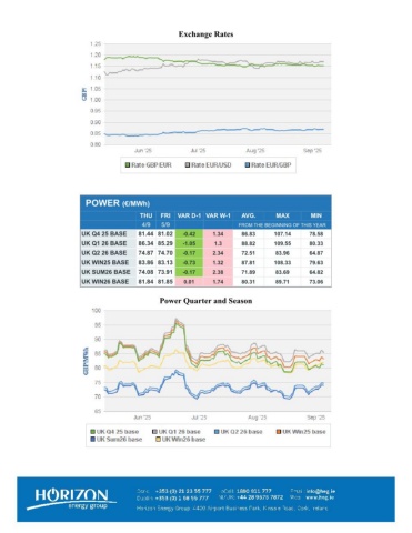 Exchange RatesPOWER (€/MWh) THUFRIVAR D-1 VAR W-1AVG.MAXMIN 4/95/9FROM THE BEGINNING OF THIS YEARUK Q4 25 BASE81.44 81.02-0.421.3486.83107.1478.58UK Q1 26 BASE86.34 85.29-1.051.388.82109.5580.33UK Q2 26 BASE74.87 74.70-0.172.3472.5183.9664.87UK WIN25 BASE83.86 83.13-0.731.3287.81108.3379.63UK SUM26 BASE74.08 73.91-0.172.3871.8983.6964.82UK WIN26 BASE81.84 81.850.011.7480.3189.7173.06Power Quarter and Season