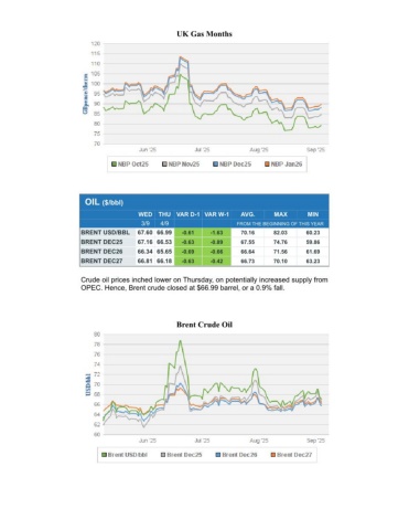 UK Gas MonthsOIL ($/bbl) WEDTHU VAR D-1 VAR W-1AVG.MAXMIN 3/94/9FROM THE BEGINNING OF THIS YEARBRENT USD/BBL67.60 66.99-0.61-1.6370.1682.0360.23BRENT DEC2567.16 66.53-0.63-0.8967.5574.7659.86BRENT DEC2666.34 65.65-0.69-0.6666.6471.5661.69BRENT DEC2766.81 66.18-0.63-0.4266.7370.1063.23Crude oil prices inched lower on Thursday, on potentially increased supply fromOPEC. Hence, Brent crude closed at $66.99 barrel, or a 0.9% fall.Brent Crude Oil
