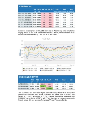 CARBON (€/T) TUE WED VAR D-1 VAR W-1AVG.MAXMIN 2/93/9FROM THE BEGINNING OF THIS YEARCO2 EUA DEC 202573.61 74.951.342.7172.2583.9360.94CO2 EUA DEC 202675.55 76.891.342.7374.2386.3562.54CO2 EUA DEC 202777.79 79.131.342.7776.5389.0764.54CO2 EUA DEC 202880.38 81.731.352.8479.1091.9466.86UK ETS DEC 25 EUR 62.00 62.900.92.7854.9665.4337.35UK ETS DEC 26 EUR 64.84 65.790.952.8657.5168.3639.48UK ETS DEC 27 EUR 67.70 68.650.952.8460.2270.8642.14European carbon prices continued to increase on Wednesday amid compliancebuying ahead of the 30th September deadline. Hence, the December 2025-expiry contract increased by 1.8% to €74.95 per tonne.CO2 EUAEXCHANGE RATES TUEWEDVAR D-1 VAR W-1AVG.MAXMIN 2/93/9FROM THE BEGINNING OF THIS YEARRATE EUR/USD1.1646 1.16530.00070.0061.11301.18101.0198RATE EUR/GBP0.8702 0.8687-0.00150.00610.84870.87170.8253RATE GBP/EUR1.1492 1.15110.0019-0.00821.17851.21171.1472The EUR/USD rate increased slightly on Wednesday ahead of an anticipatedgloomy US economic data to be published this week. The EUR/USD ratesettled at 1.1653, registering a 0.1% increase, Meanwhile Meanwhile theEUR/GBP pair ended at 0.8687 or a 0.17% on the back of a weaker euro due toFrench polical risk and underperformance of French Treasure Bonds.