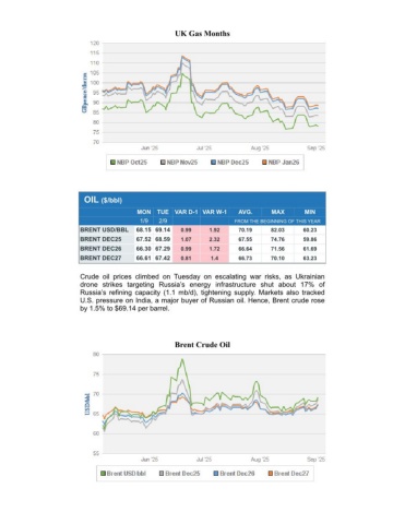UK Gas MonthsOIL ($/bbl) MONTUE VAR D-1 VAR W-1AVG.MAXMIN 1/92/9FROM THE BEGINNING OF THIS YEARBRENT USD/BBL68.15 69.140.991.9270.1982.0360.23BRENT DEC2567.52 68.591.072.3267.5574.7659.86BRENT DEC2666.30 67.290.991.7266.6471.5661.69BRENT DEC2766.61 67.420.811.466.7370.1063.23Crude oil prices climbed on Tuesday on escalating war risks, as Ukrainiandrone strikes targeting Russia’s energy infrastructure shut about 17% ofRussia’s refining capacity (1.1 mb/d), tightening supply. Markets also trackedU.S. pressure on India, a major buyer of Russian oil. Hence, Brent crude roseby 1.5% to $69.14 per barrel.Brent Crude Oil