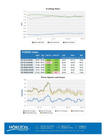 Exchange RatesPOWER (€/MWh) MONTUE VAR D-1 VAR W-1AVG.MAXMIN 1/92/9FROM THE BEGINNING OF THIS YEARUK Q4 25 BASE80.83 80.30-0.53-1.7986.93107.1478.58UK Q1 26 BASE85.00 85.140.14-0.7888.88109.5580.33UK Q2 26 BASE73.58 73.49-0.09-0.0472.4883.9664.87UK WIN25 BASE82.89 82.69-0.2-1.387.89108.3379.63UK SUM26 BASE72.74 72.68-0.06-0.0171.8683.6964.82UK WIN26 BASE81.02 80.96-0.060.180.2889.7173.06Power Quarter and Season