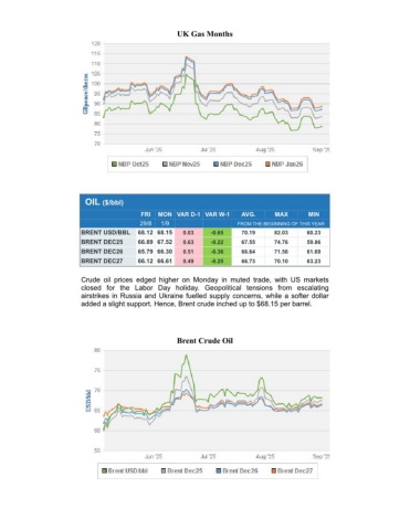 UK Gas MonthsOIL ($/bbl) FRIMON VAR D-1 VAR W-1AVG.MAXMIN 29/81/9FROM THE BEGINNING OF THIS YEARBRENT USD/BBL68.12 68.150.03-0.6570.1982.0360.23BRENT DEC2566.89 67.520.63-0.2267.5574.7659.86BRENT DEC2665.79 66.300.51-0.3666.6471.5661.69BRENT DEC2766.12 66.610.49-0.2566.7370.1063.23Crude oil prices edged higher on Monday in muted trade, with US marketsclosed for the Labor Day holiday. Geopolitical tensions from escalatingairstrikes in Russia and Ukraine fuelled supply concerns, while a softer dollaradded a slight support. Hence, Brent crude inched up to $68.15 per barrel.Brent Crude Oil