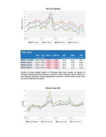 UK Gas MonthsOIL ($/bbl) WEDTHU VAR D-1 VAR W-1AVG.MAXMIN 27/828/8FROM THE BEGINNING OF THIS YEARBRENT USD/BBL68.05 68.620.570.9570.2282.0360.23BRENT DEC2566.89 67.420.530.7667.5574.7659.86BRENT DEC2665.89 66.310.420.3966.6571.5661.69BRENT DEC2766.26 66.600.340.3266.7370.1063.23Crude oil prices settled higher on Thursday after early losses, as reports ofRussian missile and drone strikes on Ukraine, along Ukrainian drone attacks ontwo Russian refineries fuelled geopolitical concerns. Hence, Brent crude roseby 0.8% to $68.62 per barrel.Brent Crude Oil