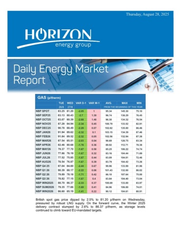 Thursday, August 28, 2025GAS (p/therm) TUEWED VAR D-1 VAR W-1AVG.MAXMIN 26/827/8FROM THE BEGINNING OF THIS YEARNBP SPOT83.25 81.20-2.05195.34145.3075.10NBP SEP2583.13 80.43-2.71.3996.74138.2976.45NBP OCT2583.07 80.39-2.681.4896.30134.3276.54NBP NOV2587.28 84.94-2.340.45100.79133.5282.91NBP DEC2590.78 88.49-2.290.07102.82135.0086.46NBP JAN2691.94 89.62-2.320.1103.15134.3987.46NBP FEB2691.84 89.52-2.320.05102.56132.9487.38NBP MAR2687.54 85.51-2.030.0498.69128.7583.34NBP APR2682.46 80.68-1.780.3689.92112.7178.38NBP MAY2679.37 77.70-1.670.5885.25106.2274.74NBP JUN2677.86 76.19-1.670.3283.16104.4471.89NBP JUL2677.52 75.85-1.670.4483.09104.0172.46NBP AUG2678.54 76.87-1.670.3983.79104.4273.26NBP Q4 2587.04 84.60-2.440.6799.96133.9981.96NBP Q1 2690.39 88.17-2.220.06101.43132.0086.02NBP Q2 2679.89 78.18-1.710.4286.10107.6475.00NBP Q3 2678.82 77.15-1.670.483.84104.4073.04NBP WIN202588.70 86.37-2.330.37100.69133.0083.97NBP SUM202679.35 77.66-1.690.4184.96106.0074.01NBP WIN202686.60 85.19-1.410.2290.12104.6180.91British spot gas price dipped by 2.5% to 81.20 p/therm on Wednesday,pressured by robust LNG supply. On the forward curve, the Winter 2025delivery contract slumped by 2.6% to 86.37 p/therm, as storage levelscontinued to climb toward EU-mandated targets.