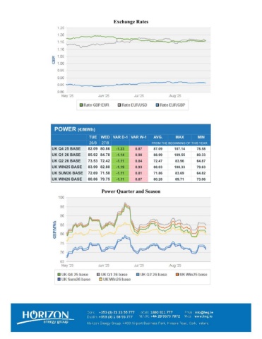 Exchange RatesPOWER (€/MWh) TUEWED VAR D-1 VAR W-1AVG.MAXMIN 26/827/8FROM THE BEGINNING OF THIS YEARUK Q4 25 BASE82.09 80.86-1.230.8787.09107.1478.58UK Q1 26 BASE85.92 84.78-1.140.9888.99109.5580.33UK Q2 26 BASE73.53 72.42-1.110.8472.4783.9664.87UK WIN25 BASE83.99 82.80-1.190.9388.03108.3379.63UK SUM26 BASE72.69 71.58-1.110.8171.8683.6964.82UK WIN26 BASE80.86 79.75-1.110.8780.2889.7173.06Power Quarter and Season