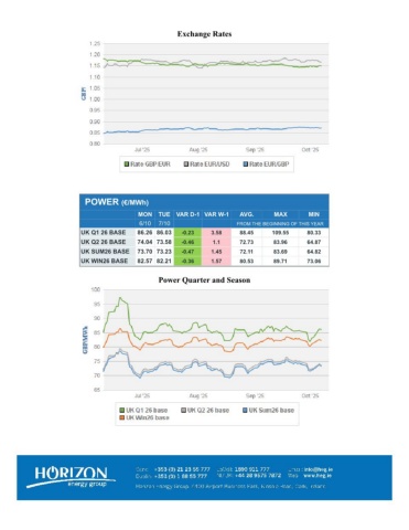 Exchange RatesPOWER (€/MWh) MONTUE VAR D-1 VAR W-1AVG.MAXMIN 6/107/10FROM THE BEGINNING OF THIS YEARUK Q1 26 BASE86.26 86.03-0.233.5888.45109.5580.33UK Q2 26 BASE74.04 73.58-0.461.172.7383.9664.87UK SUM26 BASE73.70 73.23-0.471.4572.1183.6964.82UK WIN26 BASE82.57 82.21-0.361.5780.5389.7173.06Power Quarter and Season