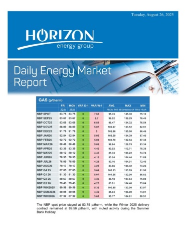 Tuesday, August 26, 2025GAS (p/therm) FRIMON VAR D-1 VAR W-1AVG.MAXMIN 22/825/8FROM THE BEGINNING OF THIS YEARNBP SPOT83.75 83.7507.6595.45145.3075.10NBP SEP2583.67 83.6706.796.92138.2976.45NBP OCT2583.68 83.6806.8196.47134.3276.54NBP NOV2588.09 88.0905.07100.97133.5282.91NBP DEC2591.78 91.7805102.98135.0086.46NBP JAN2692.84 92.8405.03103.30134.3987.46NBP FEB2692.72 92.7205.09102.70132.9487.38NBP MAR2688.48 88.4805.0998.84128.7583.34NBP APR2683.35 83.3504.4690.02112.7178.38NBP MAY2680.12 80.1204.4685.33106.2274.74NBP JUN2678.55 78.5504.1683.24104.4471.89NBP JUL2678.09 78.0904.2883.16104.0172.46NBP AUG2679.17 79.1704.2883.86104.4273.26NBP Q4 2587.85 87.8505.64100.13133.9981.96NBP Q1 2691.30 91.3005.07101.58132.0086.02NBP Q2 2680.67 80.6704.3686.18107.6475.00NBP Q3 2679.43 79.4304.2783.91104.4073.04NBP WIN202589.56 89.5605.36100.85133.0083.97NBP SUM202680.05 80.0504.3285.04106.0074.01NBP WIN202687.32 87.3203.6190.17104.6180.91The NBP spot price stayed at 83.75 p/therm, while the Winter 2025 deliverycontract remained at 89.56 p/therm, with muted activity during the SummerBank Holiday.
