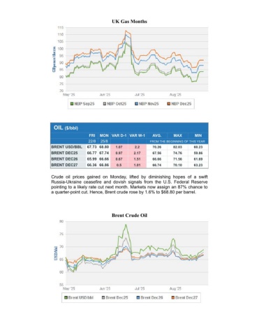 UK Gas MonthsOIL ($/bbl) FRIMON VAR D-1 VAR W-1AVG.MAXMIN 22/825/8FROM THE BEGINNING OF THIS YEARBRENT USD/BBL67.73 68.801.072.270.2682.0360.23BRENT DEC2566.77 67.740.972.1767.5674.7659.86BRENT DEC2665.99 66.660.671.5166.6671.5661.69BRENT DEC2766.36 66.860.51.0166.7470.1063.23Crude oil prices gained on Monday, lifted by diminishing hopes of a swiftRussia-Ukraine ceasefire and dovish signals from the U.S. Federal Reservepointing to a likely rate cut next month. Markets now assign an 87% chance toa quarter-point cut. Hence, Brent crude rose by 1.6% to $68.80 per barrel.Brent Crude Oil