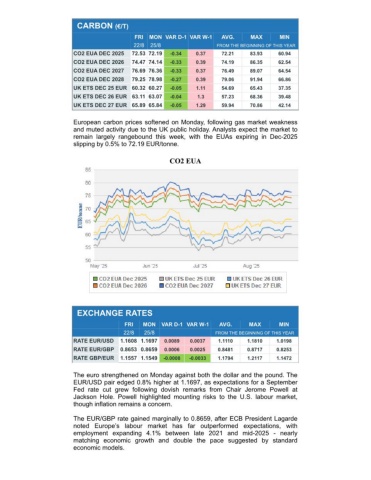 CARBON (€/T) FRIMON VAR D-1 VAR W-1AVG.MAXMIN 22/825/8FROM THE BEGINNING OF THIS YEARCO2 EUA DEC 202572.53 72.19-0.340.3772.2183.9360.94CO2 EUA DEC 202674.47 74.14-0.330.3974.1986.3562.54CO2 EUA DEC 202776.69 76.36-0.330.3776.4989.0764.54CO2 EUA DEC 202879.25 78.98-0.270.3979.0691.9466.86UK ETS DEC 25 EUR 60.32 60.27-0.051.1154.6965.4337.35UK ETS DEC 26 EUR 63.11 63.07-0.041.357.2368.3639.48UK ETS DEC 27 EUR 65.89 65.84-0.051.2959.9470.8642.14European carbon prices softened on Monday, following gas market weaknessand muted activity due to the UK public holiday. Analysts expect the market toremain largely rangebound this week, with the EUAs expiring in Dec-2025slipping by 0.5% to 72.19 EUR/tonne.CO2 EUAEXCHANGE RATES FRIMONVAR D-1 VAR W-1AVG.MAXMIN 22/825/8FROM THE BEGINNING OF THIS YEARRATE EUR/USD1.1608 1.16970.00890.00371.11101.18101.0198RATE EUR/GBP0.8653 0.86590.00060.00250.84810.87170.8253RATE GBP/EUR1.1557 1.1549-0.0008-0.00331.17941.21171.1472The euro strengthened on Monday against both the dollar and the pound. TheEUR/USD pair edged 0.8% higher at 1.1697, as expectations for a SeptemberFed rate cut grew following dovish remarks from Chair Jerome Powell atJackson Hole. Powell highlighted mounting risks to the U.S. labour market,though inflation remains a concern.The EUR/GBP rate gained marginally to 0.8659, after ECB President Lagardenoted Europe’s labour market has far outperformed expectations, withemployment expanding 4.1% between late 2021 and mid-2025 - nearlymatching economic growth and double the pace suggested by standardeconomic models.