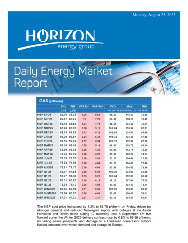 Monday, August 25, 2025GAS (p/therm) THUFRIVAR D-1 VAR W-1AVG.MAXMIN 21/822/8FROM THE BEGINNING OF THIS YEARNBP SPOT82.70 83.751.058.6595.50145.3075.10NBP SEP2582.47 83.671.27.2297.00138.2976.45NBP OCT2582.44 83.681.247.1496.55134.3276.54NBP NOV2587.43 88.090.665.18101.04133.5282.91NBP DEC2591.05 91.780.735.32103.05135.0086.46NBP JAN2692.20 92.840.645.38103.36134.3987.46NBP FEB2692.15 92.720.575.34102.76132.9487.38NBP MAR2688.10 88.480.385.1498.90128.7583.34NBP APR2682.99 83.350.364.2290.06112.7178.38NBP MAY2679.76 80.120.364.2285.36106.2274.74NBP JUN2678.19 78.550.363.9283.26104.4471.89NBP JUL2677.73 78.090.364.0483.19104.0172.46NBP AUG2678.81 79.170.364.0483.89104.4273.26NBP Q4 2586.97 87.850.885.89100.20133.9981.96NBP Q1 2690.77 91.300.535.28101.64132.0086.02NBP Q2 2680.31 80.670.364.1286.22107.6475.00NBP Q3 2679.08 79.430.354.0383.93104.4073.04NBP WIN202588.85 89.560.715.59100.91133.0083.97NBP SUM202679.69 80.050.364.0885.07106.0074.01NBP WIN202687.01 87.320.313.3790.19104.6180.91The NBP spot price increased by 1.3% to 83.75 p/therm on Friday, driven bystronger demand and reduced Norwegian supply, with outages at the AastaHansteen and Dvalin fields cutting 12 mcm/day until 8 September. On theforward curve, the Winter 2025 delivery contract rose by 0.8% to 89.56 p/therm,as fading peace prospects and damage to a Ukrainian compressor stationfuelled concerns over winter demand and storage in Europe.