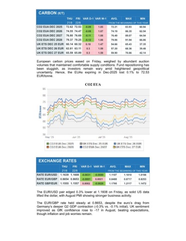 CARBON (€/T) THUFRI VAR D-1 VAR W-1AVG.MAXMIN 21/822/8FROM THE BEGINNING OF THIS YEARCO2 EUA DEC 202572.62 72.53-0.091.8572.2183.9360.94CO2 EUA DEC 202674.55 74.47-0.081.8774.1986.3562.54CO2 EUA DEC 202776.80 76.69-0.111.8876.4989.0764.54CO2 EUA DEC 202879.37 79.25-0.121.8879.0691.9466.86UK ETS DEC 25 EUR 60.14 60.320.181.4754.6665.4337.35UK ETS DEC 26 EUR 62.81 63.110.31.5957.2068.3639.48UK ETS DEC 27 EUR 65.59 65.890.31.5959.9070.8642.14European carbon prices eased on Friday, weighed by abundant auctionvolumes that maintained comfortable supply conditions. Fund repositioning hasbeen sluggish, as investors remain wary amid heightened geopoliticaluncertainty. Hence, the EUAs expiring in Dec-2025 lost 0.1% to 72.53EUR/tonne.CO2 EUAEXCHANGE RATES THUFRIVAR D-1 VAR W-1AVG.MAXMIN 21/822/8FROM THE BEGINNING OF THIS YEARRATE EUR/USD1.1639 1.1608-0.0031-0.00891.11071.18101.0198RATE EUR/GBP0.8654 0.8653-0.00010.00210.84800.87170.8253RATE GBP/EUR1.1555 1.15570.0002-0.00281.17951.21171.1472The EUR/USD pair edged 0.3% lower at 1.1608 on Friday, as solid US datalifted the dollar, with August PMI showing stronger business activity.The EUR/GBP rate held steady at 0.8653, despite the euro’s drag fromGermany’s deeper Q2 GDP contraction (-0.3% vs. -0.1% initial). UK sentimentimproved as GfK confidence rose to -17 in August, beating expectations,though inflation and job worries remain.