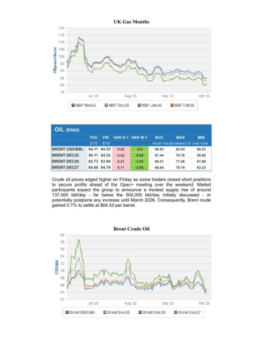 UK Gas MonthsOIL ($/bbl) THUFRIVAR D-1 VAR W-1AVG.MAXMIN 2/103/10FROM THE BEGINNING OF THIS YEARBRENT USD/BBL64.11 64.530.42-5.669.8382.0360.23BRENT DEC2564.11 64.530.42-4.6967.4474.7659.86BRENT DEC2663.73 63.940.21-3.0266.5171.5661.69BRENT DEC2764.68 64.790.11-2.0866.6470.1063.23Crude oil prices edged higher on Friday as some traders closed short positionsto secure profits ahead of the Opec+ meeting over the weekend. Marketparticipants expect the group to announce a modest supply rise of around137,000 bbl/day - far below the 500,000 bbl/day initially discussed - orpotentially postpone any increase until March 2026. Consequently, Brent crudegained 0.7% to settle at $64.53 per barrel.Brent Crude Oil