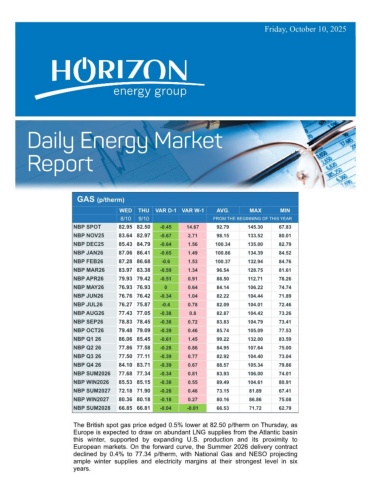 Friday, October 10, 2025GAS (p/therm) WEDTHUVAR D-1 VAR W-1AVG.MAXMIN 8/109/10FROM THE BEGINNING OF THIS YEARNBP SPOT82.95 82.50-0.4514.6792.79145.3067.83NBP NOV2583.64 82.97-0.672.7198.15133.5280.01NBP DEC2585.43 84.79-0.641.56100.34135.0082.79NBP JAN2687.06 86.41-0.651.49100.86134.3984.52NBP FEB2687.28 86.68-0.61.53100.37132.9484.76NBP MAR2683.97 83.38-0.591.3496.54128.7581.61NBP APR2679.93 79.42-0.510.9188.50112.7178.26NBP MAY2676.93 76.9300.6484.14106.2274.74NBP JUN2676.76 76.42-0.341.0482.22104.4471.89NBP JUL2676.27 75.87-0.40.7882.09104.0172.46NBP AUG2677.43 77.05-0.380.882.87104.4273.26NBP SEP2678.83 78.45-0.380.7283.83104.7973.41NBP OCT2679.48 79.09-0.390.4685.74105.0977.53NBP Q1 2686.06 85.45-0.611.4599.22132.0083.59NBP Q2 2677.86 77.58-0.280.8684.95107.6475.00NBP Q3 2677.50 77.11-0.390.7782.92104.4073.04NBP Q4 2684.10 83.71-0.390.6788.57105.3479.86NBP SUM202677.68 77.34-0.340.8183.93106.0074.01NBP WIN202685.53 85.15-0.380.5589.49104.6180.91NBP SUM202772.18 71.90-0.280.4673.1581.8967.41NBP WIN202780.36 80.18-0.180.2780.1686.8675.08NBP SUM202866.85 66.81-0.04-0.0166.5371.7262.79The British spot gas price edged 0.5% lower at 82.50 p/therm on Thursday, asEurope is expected to draw on abundant LNG supplies from the Atlantic basinthis winter, supported by expanding U.S. production and its proximity toEuropean markets. On the forward curve, the Summer 2026 delivery contractdeclined by 0.4% to 77.34 p/therm, with National Gas and NESO projectingample winter supplies and electricity margins at their strongest level in sixyears.