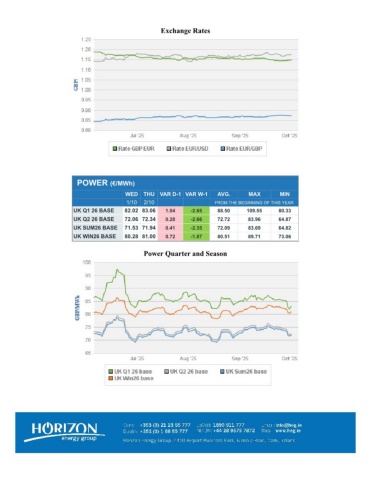 Exchange RatesPOWER (€/MWh) WEDTHU VAR D-1 VAR W-1AVG.MAXMIN 1/102/10FROM THE BEGINNING OF THIS YEARUK Q1 26 BASE82.02 83.061.04-2.6588.50109.5580.33UK Q2 26 BASE72.06 72.340.28-2.6672.7283.9664.87UK SUM26 BASE71.53 71.940.41-2.3572.0983.6964.82UK WIN26 BASE80.28 81.000.72-1.8780.5189.7173.06Power Quarter and Season