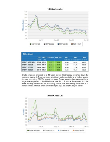 UK Gas MonthsOIL ($/bbl) TUEWED VAR D-1 VAR W-1AVG.MAXMIN 30/91/10FROM THE BEGINNING OF THIS YEARBRENT USD/BBL67.02 65.35-1.67-3.9669.8882.0360.23BRENT DEC2566.03 65.35-0.68-3.1167.4874.7659.86BRENT DEC2664.84 64.47-0.37-1.7466.5471.5661.69BRENT DEC2765.48 65.27-0.21-0.9966.6670.1063.23Crude oil prices dropped to a 16-week low on Wednesday, weighed down byconcerns over a U.S. government shutdown and expectations of higher supplyfrom an upcoming OPEC+ output increase. Prices were further pressured by alarger-than-expected 1.8-million-barrel rise in U.S. crude inventories for theweek ending September 26, according to the EIA, surpassing forecasts of 1million barrels. Hence, Brent crude slumped by 2.5% to $65.35 per barrel.Brent Crude Oil