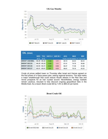 UK Gas MonthsOIL ($/bbl) WEDTHU VAR D-1 VAR W-1AVG.MAXMIN 8/109/10FROM THE BEGINNING OF THIS YEARBRENT USD/BBL66.25 65.22-1.031.1169.7482.0360.23BRENT DEC2566.25 65.22-1.031.1167.4174.7659.86BRENT DEC2664.93 64.31-0.620.5866.4771.5661.69BRENT DEC2765.51 65.01-0.50.3366.6170.1063.23Crude oil prices settled lower on Thursday after Israel and Hamas agreed onthe first phase of a Gaza peace plan, easing regional tensions. The deal marksa major breakthrough that could reduce Houthi attacks in the Red Sea andrevive prospects for an Iran nuclear accord. Nevertheless, energy marketsremain cautious, reluctant to fully discount ongoing geopolitical risks in theMiddle East. As a result, Brent crude fell by 1.6% to $65.22 per barrel.Brent Crude Oil