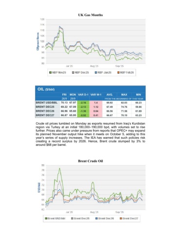 UK Gas MonthsOIL ($/bbl) FRIMON VAR D-1 VAR W-1AVG.MAXMIN 26/929/9FROM THE BEGINNING OF THIS YEARBRENT USD/BBL70.13 67.97-2.161.469.9282.0360.23BRENT DEC2569.22 67.09-2.131.1267.4974.7659.86BRENT DEC2666.96 65.60-1.360.6466.5671.5661.69BRENT DEC2766.87 65.95-0.920.4166.6770.1063.23Crude oil prices tumbled on Monday as exports resumed from Iraq’s Kurdistanregion via Turkey at an initial 180,000–190,000 bpd, with volumes set to risefurther. Prices also came under pressure from reports that OPEC+ may expandits planned November output hike when it meets on October 5, adding to thisyear’s series of supply increases. The IEA has warned that such policies riskcreating a record surplus by 2026. Hence, Brent crude slumped by 3% toaround $68 per barrel.Brent Crude Oil