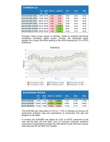 CARBON (€/T) FRIMON VAR D-1 VAR W-1AVG.MAXMIN 26/929/9FROM THE BEGINNING OF THIS YEARCO2 EUA DEC 202575.98 76.790.810.5872.6683.9360.94CO2 EUA DEC 202678.00 78.820.820.5874.6386.3562.54CO2 EUA DEC 202780.27 81.100.830.5976.9389.0764.54CO2 EUA DEC 202882.84 83.670.830.6179.5091.9466.86UK ETS DEC 25 EUR 62.13 63.461.33-1.2555.9267.0437.35UK ETS DEC 26 EUR 65.12 66.401.28-1.3458.5170.0439.48UK ETS DEC 27 EUR 68.06 69.351.29-1.4761.2673.1442.14European carbon prices soared on Monday, fuelled by potential last-minutecompliance purchases, tighter auction volumes, and anticipated higherdemand. As a result, the EUAs expiring in Dec-2025 advanced by 1% to 76.79EUR/tonne.CO2 EUAEXCHANGE RATES FRIMONVAR D-1 VAR W-1AVG.MAXMIN 26/929/9FROM THE BEGINNING OF THIS YEARRATE EUR/USD1.1672 1.17230.0051-0.00581.11871.18371.0198RATE EUR/GBP0.8740 0.8723-0.0017-0.00060.85070.87480.8253RATE GBP/EUR1.1442 1.14640.00220.00081.17581.21171.1431The EUR/USD pair rebounded by 0.4% to 1.1723 on Monday as looming USgovernment shutdown risks and expectations of consecutive Fed rate cutsweighed on the Dollar.In contrast, the EUR/GBP rate slipped by 0.2% to 0.8723, pressured by theview that the BoE will hold rates, even as Eurozone consumer sentimentimproved but stayed below average. Key data ahead include Germany’s Augustretail sales and UK Q2 GDP, due Tuesday.