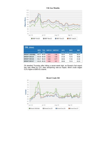 UK Gas MonthsOIL ($/bbl) WEDTHU VAR D-1 VAR W-1AVG.MAXMIN 24/925/9FROM THE BEGINNING OF THIS YEARBRENT USD/BBL69.31 69.420.111.9869.9382.0360.23BRENT DEC2568.46 68.580.121.6667.4974.7659.86BRENT DEC2666.21 66.430.220.7766.5671.5661.69BRENT DEC2766.26 66.520.260.566.6870.1063.23Oil steadied Thursday after hitting a seven-week high, as Russia’s fuel exportban was offset by U.S. data dampening rate-cut hopes. Brent crude edged0.2% higher at $69.42 a barrel.Brent Crude Oil