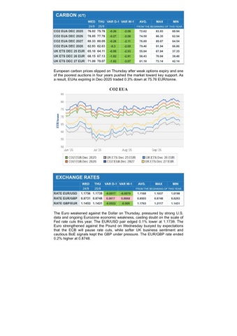 CARBON (€/T) WED THU VAR D-1 VAR W-1AVG.MAXMIN 24/925/9FROM THE BEGINNING OF THIS YEARCO2 EUA DEC 202576.02 75.76-0.26-2.0872.6283.9360.94CO2 EUA DEC 202678.05 77.78-0.27-2.0874.5986.3562.54CO2 EUA DEC 202780.33 80.05-0.28-2.1176.8989.0764.54CO2 EUA DEC 202882.93 82.63-0.3-2.0979.4691.9466.86UK ETS DEC 25 EUR 65.10 64.11-0.99-2.9355.8467.0437.35UK ETS DEC 26 EUR 68.15 67.13-1.02-2.9158.4370.0439.48UK ETS DEC 27 EUR 71.09 70.07-1.02-3.0761.1873.1442.14European carbon prices slipped on Thursday after weak options expiry and oneof the poorest auctions in four years pushed the market toward key support. Asa result, EUAs expiring in Dec-2025 traded 0.3% down at 75.76 EUR/tonne.CO2 EUAEXCHANGE RATES WEDTHUVAR D-1 VAR W-1AVG.MAXMIN 24/925/9FROM THE BEGINNING OF THIS YEARRATE EUR/USD1.1756 1.1739-0.0017-0.00791.11801.18371.0198RATE EUR/GBP0.8731 0.87480.00170.00680.85030.87480.8253RATE GBP/EUR1.1453 1.1431-0.0022-0.0091.17631.21171.1431The Euro weakened against the Dollar on Thursday, pressured by strong U.S.data and ongoing Eurozone economic weakness, casting doubt on the scale ofFed rate cuts this year. The EUR/USD pair edged 0.1% lower at 1.1739. TheEuro strengthened against the Pound on Wednesday buoyed by expectationsthat the ECB will pause rate cuts, while softer UK business sentiment andcautious BoE signals kept the GBP under pressure. The EUR/GBP rate ended0.2% higher at 0.8748.
