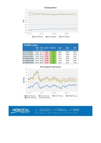 Exchange RatesPOWER (€/MWh) WEDTHU VAR D-1 VAR W-1AVG.MAXMIN 24/925/9FROM THE BEGINNING OF THIS YEARUK Q4 25 BASE80.49 81.140.65-1.6386.43107.1478.58UK Q1 26 BASE85.60 85.710.11-1.4588.63109.5580.33UK Q2 26 BASE74.84 75.000.16-1.4972.7183.9664.87UK WIN25 BASE83.02 83.400.38-1.5487.52108.3379.63UK SUM26 BASE74.13 74.290.16-1.4572.0883.6964.82UK WIN26 BASE82.74 82.870.13-0.6480.4989.7173.06Power Quarter and Season