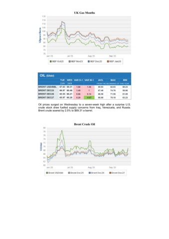 UK Gas MonthsOIL ($/bbl) TUEWED VAR D-1 VAR W-1AVG.MAXMIN 23/924/9FROM THE BEGINNING OF THIS YEARBRENT USD/BBL67.63 69.311.681.3669.9382.0360.23BRENT DEC2566.97 68.461.49167.4874.7659.86BRENT DEC2665.55 66.210.660.1466.5671.5661.69BRENT DEC2765.97 66.260.29-0.0766.6870.1063.23Oil prices surged on Wednesday to a seven-week high after a surprise U.S.crude stock draw fuelled supply concerns from Iraq, Venezuela, and Russia.Brent crude soared by 2.5% to $69.31 a barrel.Brent Crude Oil
