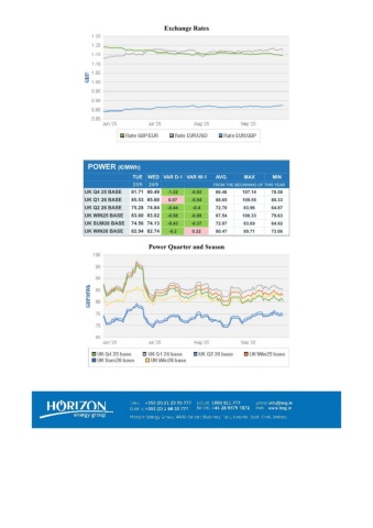 Exchange RatesPOWER (€/MWh) TUEWED VAR D-1 VAR W-1AVG.MAXMIN 23/924/9FROM THE BEGINNING OF THIS YEARUK Q4 25 BASE81.71 80.49-1.22-0.8286.46107.1478.58UK Q1 26 BASE85.53 85.600.07-0.9488.65109.5580.33UK Q2 26 BASE75.28 74.84-0.44-0.472.7083.9664.87UK WIN25 BASE83.60 83.02-0.58-0.8887.54108.3379.63UK SUM26 BASE74.56 74.13-0.43-0.3772.0783.6964.82UK WIN26 BASE82.94 82.74-0.20.2280.4789.7173.06Power Quarter and Season