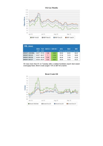 UK Gas MonthsOIL ($/bbl) MONTUE VAR D-1 VAR W-1AVG.MAXMIN 22/923/9FROM THE BEGINNING OF THIS YEARBRENT USD/BBL66.57 67.631.06-0.8469.9482.0360.23BRENT DEC2565.97 66.971-1.0467.4874.7659.86BRENT DEC2664.96 65.550.59-1.1466.5671.5661.69BRENT DEC2765.54 65.970.43-0.9166.6870.1063.23Oil rose more than $1 on Tuesday after a stalled Kurdistan export deal easedoversupply fears. Brent crude surged 1.6% to $67.63 a barrel.Brent Crude Oil