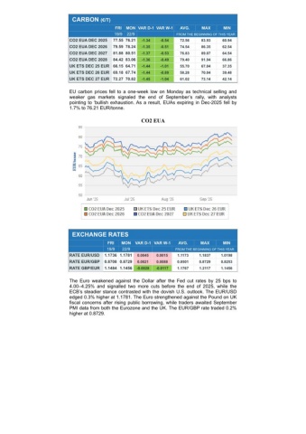 CARBON (€/T) FRIMON VAR D-1 VAR W-1AVG.MAXMIN 19/922/9FROM THE BEGINNING OF THIS YEARCO2 EUA DEC 202577.55 76.21-1.34-0.5472.5683.9360.94CO2 EUA DEC 202679.59 78.24-1.35-0.5174.5486.3562.54CO2 EUA DEC 202781.88 80.51-1.37-0.5376.8389.0764.54CO2 EUA DEC 202884.42 83.06-1.36-0.4979.4091.9466.86UK ETS DEC 25 EUR 66.15 64.71-1.44-1.0155.7067.0437.35UK ETS DEC 26 EUR 69.18 67.74-1.44-0.8958.2870.0439.48UK ETS DEC 27 EUR 72.27 70.82-1.45-1.0461.0273.1442.14EU carbon prices fell to a one-week low on Monday as technical selling andweaker gas markets signaled the end of September’s rally, with analystspointing to ‘bullish exhaustion. As a result, EUAs expiring in Dec-2025 fell by1.7% to 76.21 EUR/tonne.CO2 EUAEXCHANGE RATES FRIMONVAR D-1 VAR W-1AVG.MAXMIN 19/922/9FROM THE BEGINNING OF THIS YEARRATE EUR/USD1.1736 1.17810.00450.00151.11731.18371.0198RATE EUR/GBP0.8708 0.87290.00210.00880.85010.87290.8253RATE GBP/EUR1.1484 1.1456-0.0028-0.01171.17671.21171.1456The Euro weakened against the Dollar after the Fed cut rates by 25 bps to4.00–4.25% and signalled two more cuts before the end of 2025, while theECB’s steadier stance contrasted with the dovish U.S. outlook. The EUR/USDedged 0.3% higher at 1.1781. The Euro strengthened against the Pound on UKfiscal concerns after rising public borrowing, while traders awaited SeptemberPMI data from both the Eurozone and the UK. The EUR/GBP rate traded 0.2%higher at 0.8729.