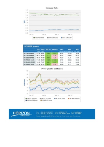Exchange RatesPOWER (€/MWh) FRIMON VAR D-1 VAR W-1AVG.MAXMIN 19/922/9FROM THE BEGINNING OF THIS YEARUK Q4 25 BASE81.50 80.47-1.03-0.1386.52107.1478.58UK Q1 26 BASE86.57 85.47-1.10.0588.68109.5580.33UK Q2 26 BASE75.73 74.80-0.930.0672.6783.9664.87UK WIN25 BASE84.00 82.95-1.05-0.0387.59108.3379.63UK SUM26 BASE74.98 74.07-0.91-0.0772.0583.6964.82UK WIN26 BASE83.34 82.62-0.720.4980.4589.7173.06Power Quarter and Season