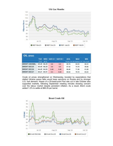 UK Gas MonthsOIL ($/bbl) TUEWED VAR D-1 VAR W-1AVG.MAXMIN 7/108/10FROM THE BEGINNING OF THIS YEARBRENT USD/BBL65.45 66.250.80.969.7682.0360.23BRENT DEC2565.45 66.250.80.967.4274.7659.86BRENT DEC2664.45 64.930.480.4666.4871.5661.69BRENT DEC2765.21 65.510.30.2466.6270.1063.23Crude oil prices strengthened on Wednesday, boosted by expectations thatstalled Ukraine peace talks would keep sanctions on Russia and by strongerU.S. fuel demand. Hopes of a 25-basis-point Fed rate cut in late October alsosupported markets, following September meeting minutes showing concernover the labour market despite persistent inflation. As a result, Brent crudeadded 1.2% to settle at $66.25 per barrel.Brent Crude Oil