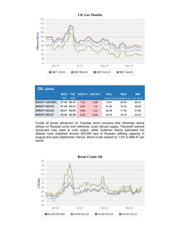 UK Gas MonthsOIL ($/bbl) MONTUE VAR D-1 VAR W-1AVG.MAXMIN 15/916/9FROM THE BEGINNING OF THIS YEARBRENT USD/BBL67.44 68.471.032.0870.0182.0360.23BRENT DEC2567.04 68.010.971.967.5074.7659.86BRENT DEC2666.01 66.690.681.2266.5971.5661.69BRENT DEC2766.44 66.880.440.8866.7070.1063.23Crude oil prices advanced on Tuesday amid concerns that Ukrainian dronestrikes on Russian ports and refineries could disrupt supply. Transneft warnedproducers may need to curb output, while Goldman Sachs estimated theattacks have sidelined around 300,000 bpd of Russian refining capacity inAugust and early September. Hence, Brent crude soared by 1.5% to $68.47 perbarrel.Brent Crude Oil