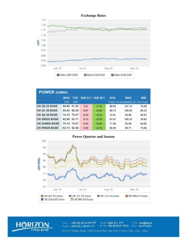 Exchange RatesPOWER (€/MWh) MONTUE VAR D-1 VAR W-1AVG.MAXMIN 15/916/9FROM THE BEGINNING OF THIS YEARUK Q4 25 BASE80.60 81.200.6-1.1486.63107.1478.58UK Q1 26 BASE85.42 86.290.87-0.4288.73109.5580.33UK Q2 26 BASE74.74 75.270.53-0.3372.6183.9664.87UK WIN25 BASE82.98 83.710.73-0.7987.67108.3379.63UK SUM26 BASE74.14 74.570.43-0.2371.9983.6964.82UK WIN26 BASE82.13 82.580.45-0.1580.3989.7173.06Power Quarter and Season