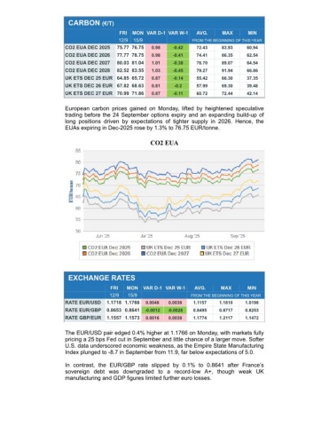 CARBON (€/T) FRIMON VAR D-1 VAR W-1AVG.MAXMIN 12/915/9FROM THE BEGINNING OF THIS YEARCO2 EUA DEC 202575.77 76.750.98-0.4272.4383.9360.94CO2 EUA DEC 202677.77 78.750.98-0.4174.4186.3562.54CO2 EUA DEC 202780.03 81.041.01-0.3876.7089.0764.54CO2 EUA DEC 202882.52 83.551.03-0.4579.2791.9466.86UK ETS DEC 25 EUR 64.85 65.720.87-0.1455.4266.3037.35UK ETS DEC 26 EUR 67.82 68.630.81-0.257.9969.3039.48UK ETS DEC 27 EUR 70.99 71.860.87-0.1160.7272.4442.14European carbon prices gained on Monday, lifted by heightened speculativetrading before the 24 September options expiry and an expanding build-up oflong positions driven by expectations of tighter supply in 2026. Hence, theEUAs expiring in Dec-2025 rose by 1.3% to 76.75 EUR/tonne.CO2 EUAEXCHANGE RATES FRIMONVAR D-1 VAR W-1AVG.MAXMIN 12/915/9FROM THE BEGINNING OF THIS YEARRATE EUR/USD1.1718 1.17660.00480.00381.11571.18101.0198RATE EUR/GBP0.8653 0.8641-0.0012-0.00280.84950.87170.8253RATE GBP/EUR1.1557 1.15730.00160.00381.17741.21171.1472The EUR/USD pair edged 0.4% higher at 1.1766 on Monday, with markets fullypricing a 25 bps Fed cut in September and little chance of a larger move. SofterU.S. data underscored economic weakness, as the Empire State ManufacturingIndex plunged to -8.7 in September from 11.9, far below expectations of 5.0.In contrast, the EUR/GBP rate slipped by 0.1% to 0.8641 after France’ssovereign debt was downgraded to a record-low A+, though weak UKmanufacturing and GDP figures limited further euro losses.