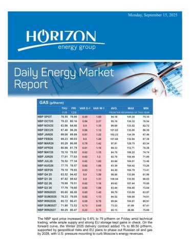 Monday, September 15, 2025GAS (p/therm) THUFRIVAR D-1 VAR W-1AVG.MAXMIN 11/912/9FROM THE BEGINNING OF THIS YEARNBP SPOT78.55 79.000.451.6594.18145.3075.10NBP OCT2579.22 80.160.942.2795.16134.3276.54NBP NOV2583.96 84.860.91.3599.69133.5282.72NBP DEC2587.40 88.260.861.12101.82135.0086.39NBP JAN2689.08 89.890.811.22102.23134.3987.46NBP FEB2689.23 90.030.81.28101.68132.9487.38NBP MAR2685.29 86.080.791.4297.81128.7583.34NBP APR2680.98 81.790.811.1889.33112.7178.38NBP MAY2678.10 78.920.821.1584.78106.2274.74NBP JUN2677.01 77.830.821.282.76104.4471.89NBP JUL2676.52 77.340.821.0582.66104.0172.46NBP AUG2677.75 78.570.821.0683.39104.4273.26NBP SEP2679.10 79.930.831.1284.30104.7973.41NBP Q4 2583.52 84.420.91.5898.88133.9981.96NBP Q1 2687.82 88.620.81.31100.54132.0086.02NBP Q2 2678.69 79.510.821.1885.62107.6475.00NBP Q3 2677.78 78.600.821.0883.44104.4073.04NBP WIN202585.65 86.500.851.4599.70133.0083.97NBP SUM202678.23 79.050.821.1384.52106.0074.01NBP WIN202685.72 86.410.690.7689.84104.6180.91NBP SUM202771.80 72.530.730.6573.2381.8967.41NBP WIN202780.25 80.470.220.7580.1386.8675.08The NBP spot price increased by 0.6% to 79 p/therm on Friday amid technicaltrading, while ample supply and strong EU storage kept gains in check. On theforward curve, the Winter 2025 delivery contract added 1% to 86.50 p/therm,supported by geopolitical risks and EU plans to phase out Russian oil and gasby 2028, with U.S. pressure mounting to curb Moscow’s energy revenues.
