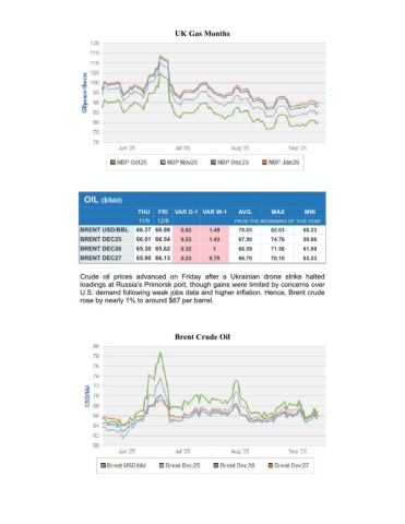 UK Gas MonthsOIL ($/bbl) THUFRIVAR D-1 VAR W-1AVG.MAXMIN 11/912/9FROM THE BEGINNING OF THIS YEARBRENT USD/BBL66.37 66.990.621.4970.0382.0360.23BRENT DEC2566.01 66.540.531.4367.5074.7659.86BRENT DEC2665.30 65.620.32166.5971.5661.69BRENT DEC2765.90 66.130.230.7566.7070.1063.23Crude oil prices advanced on Friday after a Ukrainian drone strike haltedloadings at Russia’s Primorsk port, though gains were limited by concerns overU.S. demand following weak jobs data and higher inflation. Hence, Brent cruderose by nearly 1% to around $67 per barrel.Brent Crude Oil