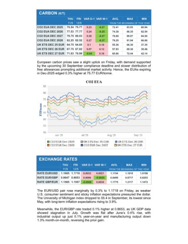 CARBON (€/T) THUFRI VAR D-1 VAR W-1AVG.MAXMIN 11/912/9FROM THE BEGINNING OF THIS YEARCO2 EUA DEC 202575.54 75.770.23-0.2772.4183.9360.94CO2 EUA DEC 202677.53 77.770.24-0.2574.3886.3562.54CO2 EUA DEC 202779.75 80.030.28-0.2776.6889.0764.54CO2 EUA DEC 202882.25 82.520.27-0.3779.2591.9466.86UK ETS DEC 25 EUR 64.75 64.850.10.1855.3666.3037.35UK ETS DEC 26 EUR 67.75 67.820.070.1257.9369.3039.48UK ETS DEC 27 EUR 71.03 70.99-0.040.1660.6672.4442.14European carbon prices saw a slight uptick on Friday, with demand supportedby the upcoming 30 September compliance deadline and slower distribution offree allowances prompting additional market activity. Hence, the EUAs expiringin Dec-2025 edged 0.3% higher at 75.77 EUR/tonne.CO2 EUAEXCHANGE RATES THUFRIVAR D-1 VAR W-1AVG.MAXMIN 11/912/9FROM THE BEGINNING OF THIS YEARRATE EUR/USD1.1685 1.17180.00330.00211.11541.18101.0198RATE EUR/GBP0.8647 0.86530.0006-0.00250.84950.87170.8253RATE GBP/EUR1.1565 1.1557-0.00080.00341.17751.21171.1472The EUR/USD pair rose marginally by 0.3% to 1.1718 on Friday, as weakerU.S. consumer sentiment and sticky inflation expectations pressured the dollar.The University of Michigan index dropped to 55.4 in September, its lowest sinceMay, with long-term inflation expectations rising to 3.9%.Meanwhile, the EUR/GBP rate traded 0.1% higher at 0.8653, as UK GDP datashowed stagnation in July. Growth was flat after June’s 0.4% rise, withindustrial output up just 0.1% year-on-year and manufacturing output down1.3% month-on-month, reversing the prior gain.