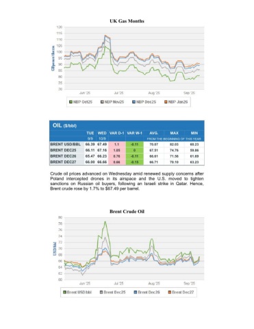 UK Gas MonthsOIL ($/bbl) TUEWED VAR D-1 VAR W-1AVG.MAXMIN 9/910/9FROM THE BEGINNING OF THIS YEARBRENT USD/BBL66.39 67.491.1-0.1170.0782.0360.23BRENT DEC2566.11 67.161.05067.5174.7659.86BRENT DEC2665.47 66.230.76-0.1166.6171.5661.69BRENT DEC2766.00 66.660.66-0.1566.7170.1063.23Crude oil prices advanced on Wednesday amid renewed supply concerns afterPoland intercepted drones in its airspace and the U.S. moved to tightensanctions on Russian oil buyers, following an Israeli strike in Qatar. Hence,Brent crude rose by 1.7% to $67.49 per barrel.Brent Crude Oil