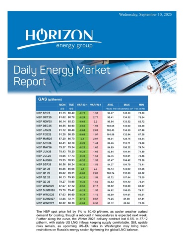 Wednesday, September 10, 2025GAS (p/therm) MONTUEVAR D-1 VAR W-1AVG.MAXMIN 8/99/9FROM THE BEGINNING OF THIS YEARNBP SPOT81.15 80.40-0.751.5594.47145.3075.10NBP OCT2581.02 80.78-0.242.7795.41134.3276.54NBP NOV2586.14 85.53-0.612.299.94133.5282.72NBP DEC2589.55 88.90-0.651.93102.05135.0086.39NBP JAN2691.12 90.48-0.642.01102.43134.3987.46NBP FEB2691.28 90.59-0.691.97101.88132.9487.38NBP MAR2687.20 86.70-0.52.0798.01128.7583.34NBP APR2682.41 82.18-0.231.4489.46112.7178.38NBP MAY2679.57 79.34-0.231.6584.89106.2274.74NBP JUN2678.43 78.20-0.231.6682.84104.4471.89NBP JUL2678.05 77.73-0.321.5382.75104.0172.46NBP AUG2679.25 78.93-0.321.5283.47104.4273.26NBP SEP2680.56 80.24-0.321.5384.37104.7973.41NBP Q4 2585.56 85.06-0.52.399.13133.9981.96NBP Q1 2689.82 89.21-0.612.02100.74132.0086.02NBP Q2 2680.13 79.90-0.231.5885.72107.6475.00NBP Q3 2679.27 78.95-0.321.5283.52104.4073.04NBP WIN202587.67 87.12-0.552.1799.92133.0083.97NBP SUM202679.70 79.42-0.281.5584.62106.0074.01NBP WIN202687.03 86.69-0.341.1689.90104.6180.91NBP SUM202772.86 72.71-0.150.6773.2581.8967.41NBP WIN202780.62 80.58-0.040.5680.1286.8675.08The NBP spot price fell by 1% to 80.40 p/therm, as cooler weather curbeddemand for cooling, though a rebound in temperatures is expected next week.Further along the curve, the Winter 2025 delivery contract lost 0.6% to 87.12p/therm, with stable US LNG inflows keeping supply comfortable. Still, upsiderisks remain, as upcoming US–EU talks in Washington may bring freshrestrictions on Russia’s energy sector, tightening the global LNG balance.
