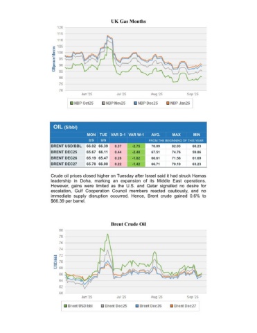 UK Gas MonthsOIL ($/bbl) MONTUE VAR D-1 VAR W-1AVG.MAXMIN 8/99/9FROM THE BEGINNING OF THIS YEARBRENT USD/BBL66.02 66.390.37-2.7570.0982.0360.23BRENT DEC2565.67 66.110.44-2.4867.5174.7659.86BRENT DEC2665.19 65.470.28-1.8266.6171.5661.69BRENT DEC2765.78 66.000.22-1.4266.7170.1063.23Crude oil prices closed higher on Tuesday after Israel said it had struck Hamasleadership in Doha, marking an expansion of its Middle East operations.However, gains were limited as the U.S. and Qatar signalled no desire forescalation, Gulf Cooperation Council members reacted cautiously, and noimmediate supply disruption occurred. Hence, Brent crude gained 0.6% to$66.39 per barrel.Brent Crude Oil