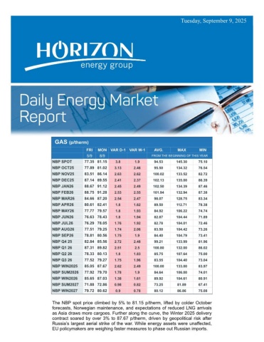 Tuesday, September 9, 2025GAS (p/therm) FRIMON VAR D-1 VAR W-1AVG.MAXMIN 5/98/9FROM THE BEGINNING OF THIS YEARNBP SPOT77.35 81.153.81.994.53145.3075.10NBP OCT2577.89 81.023.132.4695.50134.3276.54NBP NOV2583.51 86.142.632.62100.02133.5282.72NBP DEC2587.14 89.552.412.37102.13135.0086.39NBP JAN2688.67 91.122.452.49102.50134.3987.46NBP FEB2688.75 91.282.532.55101.94132.9487.38NBP MAR2684.66 87.202.542.4798.07128.7583.34NBP APR2680.61 82.411.81.6289.50112.7178.38NBP MAY2677.77 79.571.81.9384.92106.2274.74NBP JUN2676.63 78.431.81.9482.87104.4471.89NBP JUL2676.29 78.051.761.9282.78104.0172.46NBP AUG2677.51 79.251.742.0683.50104.4273.26NBP SEP2678.81 80.561.751.984.40104.7973.41NBP Q4 2582.84 85.562.722.4899.21133.9981.96NBP Q1 2687.31 89.822.512.5100.80132.0086.02NBP Q2 2678.33 80.131.81.8385.75107.6475.00NBP Q3 2677.52 79.271.751.9683.55104.4073.04NBP WIN202585.05 87.672.622.49100.00133.0083.97NBP SUM202677.92 79.701.781.984.64106.0074.01NBP WIN202685.65 87.031.381.6189.92104.6180.91NBP SUM202771.88 72.860.980.8273.2581.8967.41NBP WIN202779.72 80.620.90.7880.1286.8675.08The NBP spot price climbed by 5% to 81.15 p/therm, lifted by colder Octoberforecasts, Norwegian maintenance, and expectations of reduced LNG arrivalsas Asia draws more cargoes. Further along the curve, the Winter 2025 deliverycontract soared by over 3% to 87.67 p/therm, driven by geopolitical risk afterRussia’s largest aerial strike of the war. While energy assets were unaffected,EU policymakers are weighing faster measures to phase out Russian imports.