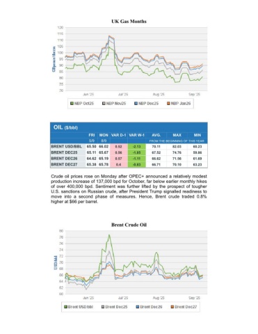 UK Gas MonthsOIL ($/bbl) FRIMON VAR D-1 VAR W-1AVG.MAXMIN 5/98/9FROM THE BEGINNING OF THIS YEARBRENT USD/BBL65.50 66.020.52-2.1370.1182.0360.23BRENT DEC2565.11 65.670.56-1.8567.5274.7659.86BRENT DEC2664.62 65.190.57-1.1166.6271.5661.69BRENT DEC2765.38 65.780.4-0.8366.7170.1063.23Crude oil prices rose on Monday after OPEC+ announced a relatively modestproduction increase of 137,000 bpd for October, far below earlier monthly hikesof over 400,000 bpd. Sentiment was further lifted by the prospect of tougherU.S. sanctions on Russian crude, after President Trump signalled readiness tomove into a second phase of measures. Hence, Brent crude traded 0.8%higher at $66 per barrel.Brent Crude Oil