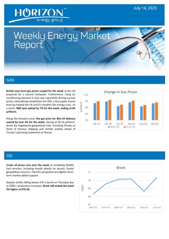 GAS OIL Crude oil prices rose over the week as escalating Middle East tensions, including Houthi attacks on vessels, fueled geopolitical concerns. The IEA’s projection of a tighter short-term market added support. Despite briefly falling below $70 a barrel on Thursday due to OPEC+ production increases, Brent still ended the week 3% higher at $70.36. July 14, 2025 50658095110Q4 25Q1 26Q2 26Win25Sum26Win26p/thermChange in Gas Prices04.07.2511.07.25676869707104.07.2507.07.2508.07.2509.07.2510.07.2511.07.25$/bblBrentBritish near-term gas prices surged for the week as the UK prepared for a second heatwave. Furthermore, rising air conditioning demand in Asia was reportedly driving up hub prices, intensifying competition for LNG, a key supply source that has helped the UK and EU weather the energy crisis. As a result, NBP spot spiked by 7% for the week, ending at 84 p/therm. Along the forward curve, the gas price for Win-25 delivery soared by over 4% for the week, closing at 96.16 p/therm, driven by heightened geopolitical risks, including threats to Strait of Hormuz shipping and market anxiety ahead of Trump’s upcoming statement on Russia.