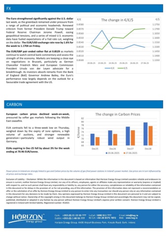 FX CARBON Power prices in Ireland are strongly linked to gas and Carbon prices by the volume of gas fired power stations in Ireland’s power market. Gas prices are in turn influenced by oil prices and exchange rates. Exclusion of Liability Disclaimer: Whilst the information in this document is based on information that Horizon Energy Group Limited considers reliable and endeavors to –ensure is current, neither Horizon Energy Group Limited, nor any of its officers, employees, agents or affiliates make any representation or warranty (express or implied) with respect to, and no such person shall have any responsibility or liability to, any person for either the accuracy, completeness or reliability of the information contained in this document or for delays in the provision of, or for not providing, any of this information. The provision of this information does not represent a recommendation or offer or the solicitation of an offer by Horizon Energy Group Limited to any person to enter into any transaction nor should any person rely on any information contained in this document for any decisions to be made by them. Any opinions expressed by Horizon Energy Group Limited in this document are personal to it and are subject to change without notice. Ownership of the copyright arising in this document belongs to Horizon Energy Group Limited and accordingly this document may not be copied, published, distributed or adapted in any fashion by any person without Horizon Energy Group Limited’s express prior written consent. Horizon Energy Group Limited is registered in Ireland with limited liability. Registered number: 452021 European carbon prices declined week-on-week, pressured by softer gas markets following the Middle East ceasefire. EUA contracts fell to a three-week low on Thursday, weighed down by the expiry of June options, a high volume of auctions, and stronger renewable generation particularly robust wind output in —Germany. EUAs expiring in Dec-25 fell by about 3% for the week ending at 70.96 EUR/tonne. 666870727476788082Dec25Dec26Dec27Dec28€/tonneThe change in Carbon Prices20.06.202527.06.20251.13501.14001.14501.15001.15501.16001.16501.17001.17500.85000.85100.85200.85300.85400.85500.85600.85700.858020.06.2523.06.2524.06.2525.06.2526.06.2527.06.25€/$€/£The change in €/£/$ €/£€/$The Euro strengthened significantly against the U.S. dollar last week, as the greenback remained under pressure from a range of political and economic headwinds. Renewed criticism from former President Donald Trump toward Federal Reserve Chairman Jerome Powell, easing geopolitical tensions, and a series of mixed U.S. economic data have fueled expectations of a Fed rate cut, weighing on the dollar. The EUR/USD exchange rate rose by 1.6% for the week to 1.1704 on Friday. The EUR/GBP pair ended rather flat at 0.8529 as markets continue to watch central bank commentary and assess the strength of the economy. Markets are keeping a close eye on negotiations in Brussels, particularly as German Chancellor Friedrich Merz and European Commission President Ursula von der Leyen advocate for a breakthrough. As investors absorb remarks from the Bank of England (BoE) Governor Andrew Bailey, the Euro’s performance now largely depends on the outlook for a favourable trade agreement with the US.