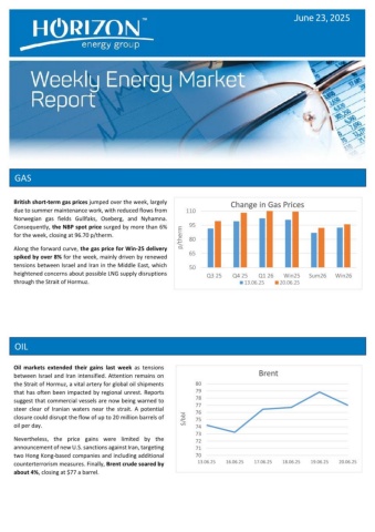 GAS OIL Oil markets extended their gains last week as tensions between Israel and Iran intensified. Attention remains on the Strait of Hormuz, a vital artery for global oil shipments that has often been impacted by regional unrest. Reports suggest that commercial vessels are now being warned to steer clear of Iranian waters near the strait. A potential closure could disrupt the flow of up to 20 million barrels of oil per day. Nevertheless, the price gains were limited by the announcement of new U.S. sanctions against Iran, targeting two Hong Kong-based companies and including additional counterterrorism measures. Finally, Brent crude soared by about 4%, closing at $77 a barrel. June 23, 2025 50658095110Q3 25Q4 25Q1 26Win25Sum26Win26p/thermChange in Gas Prices13.06.2520.06.25707172737475767778798013.06.2516.06.2517.06.2518.06.2519.06.2520.06.25$/bblBrentBritish short-term gas prices jumped over the week, largely due to summer maintenance work, with reduced flows from Norwegian gas fields Gullfaks, Oseberg, and Nyhamna. Consequently, the NBP spot price surged by more than 6% for the week, closing at 96.70 p/therm. Along the forward curve, the gas price for Win-25 delivery spiked by over 8% for the week, mainly driven by renewed tensions between Israel and Iran in the Middle East, which heightened concerns about possible LNG supply disruptions through the Strait of Hormuz.