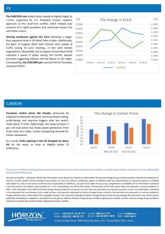 FX CARBON Power prices in Ireland are strongly linked to gas and Carbon prices by the volume of gas fired power stations in Ireland’s power market. Gas prices are in turn influenced by oil prices and exchange rates. Exclusion of Liability Disclaimer: Whilst the information in this document is based on information that Horizon Energy Group Limited considers reliable and endeavors to –ensure is current, neither Horizon Energy Group Limited, nor any of its officers, employees, agents or affiliates make any representation or warranty (express or implied) with respect to, and no such person shall have any responsibility or liability to, any person for either the accuracy, completeness or reliability of the information contained in this document or for delays in the provision of, or for not providing, any of this information. The provision of this information does not represent a recommendation or offer or the solicitation of an offer by Horizon Energy Group Limited to any person to enter into any transaction nor should any person rely on any information contained in this document for any decisions to be made by them. Any opinions expressed by Horizon Energy Group Limited in this document are personal to it and are subject to change without notice. Ownership of the copyright arising in this document belongs to Horizon Energy Group Limited and accordingly this document may not be copied, published, distributed or adapted in any fashion by any person without Horizon Energy Group Limited’s express prior written consent. Horizon Energy Group Limited is registered in Ireland with limited liability. Registered number: 452021 European carbon prices fell sharply, pressured by subdued fundamental demand, technical-driven selling, profit-taking, and stop-loss triggers after last week’s climb above 75 EUR. Additionally, the steep increase in gas and coal prices has made power generation from these fuels less viable, further dampening demand for carbon allowances. As a result, EUAs expiring in Dec-25 dropped by about 4% for the week, to close at slilghtly below 73 EUR/tonne. 66687072747678808284Dec25Dec26Dec27Dec28€/tonneThe change in Carbon Prices13.06.202520.06.20251.14201.14401.14601.14801.15001.15201.15401.15601.15801.16000.84800.84900.85000.85100.85200.85300.85400.85500.856013.06.2516.06.2517.06.2518.06.2519.06.2520.06.25€/$€/£The change in €/£/$ €/£€/$The EUR/USD rate ended rather steady to slightly higher at 1.1515, supported by U.S. President Trump's cautious approach to the Israel-Iran conflict, which helped ease concerns of a rapid escalation and restrained moves into safe-haven assets. Sterling weakened against the Euro following a larger-than-expected drop in UK Retail Sales in May. Additionally, the Bank of England (BoE) held interest rates steady at 4.25% during its June meeting, in line with market expectations. Meanwhile, the European Central Bank (ECB) indicated a pause in policy easing this month, despite forecasts suggesting inflation will fall below its 2% target. Consequently, the EUR/GBP pair rose by 0.4% for the week, closing at 0.8537.