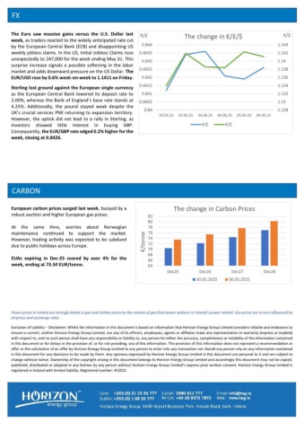 FX CARBON Power prices in Ireland are strongly linked to gas and Carbon prices by the volume of gas fired power stations in Ireland’s power market. Gas prices are in turn influenced by oil prices and exchange rates. Exclusion of Liability Disclaimer: Whilst the information in this document is based on information that Horizon Energy Group Limited considers reliable and endeavors to –ensure is current, neither Horizon Energy Group Limited, nor any of its officers, employees, agents or affiliates make any representation or warranty (express or implied) with respect to, and no such person shall have any responsibility or liability to, any person for either the accuracy, completeness or reliability of the information contained in this document or for delays in the provision of, or for not providing, any of this information. The provision of this information does not represent a recommendation or offer or the solicitation of an offer by Horizon Energy Group Limited to any person to enter into any transaction nor should any person rely on any information contained in this document for any decisions to be made by them. Any opinions expressed by Horizon Energy Group Limited in this document are personal to it and are subject to change without notice. Ownership of the copyright arising in this document belongs to Horizon Energy Group Limited and accordingly this document may not be copied, published, distributed or adapted in any fashion by any person without Horizon Energy Group Limited’s express prior written consent. Horizon Energy Group Limited is registered in Ireland with limited liability. Registered number: 452021 European carbon prices surged last week , buoyed by a robust auction and higher European gas prices. At the same time, worries about Norwegian maintenance continued to support the market. However, trading activity was expected to be subdued due to public holidays across Europe. EUAs expiring in Dec-25 soared by over 4% for the week, ending at 73.50 EUR/tonne. 64666870727476788082Dec25Dec26Dec27Dec28€/tonneThe change in Carbon Prices30.05.202506.05.20251.1281.131.1321.1341.1361.1381.141.1421.1440.840.84050.8410.84150.8420.84250.8430.84350.84430.05.2502.06.2503.06.2504.06.2505.06.2506.06.25€/$€/£The change in €/£/$ €/£€/$The Euro saw massive gains versus the U.S. Dollar last week, as traders reacted to the widely anticipated rate cut by the European Central Bank (ECB) and disappointing US weekly jobless claims. In the US, Initial Jobless Claims rose unexpectedly to 247,000 for the week ending May 31. This surprise increase signals a possible softening in the labor market and adds downward pressure on the US Dollar. The EUR/USD rose by 0.6% week-on-week to 1.1411 on Friday. Sterling lost ground against the European single currency as the European Central Bank lowered its deposit rate to 2.00%, whereas the Bank of England’s base rate stands at 4.25%. Additionally, the pound stayed weak despite the UK’s crucial services PMI returning to expansion territory. However, the uptick did not lead to a rally in Sterling, as investors showed little interest in buying GBP. Consequently, the EUR/GBP rate edged 0.2% higher for the week, closing at 0.8426.
