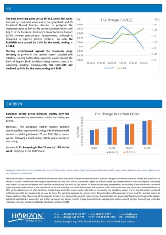 FX CARBON Power prices in Ireland are strongly linked to gas and Carbon prices by the volume of gas fired power stations in Ireland’s power market. Gas prices are in turn influenced by oil prices and exchange rates. Exclusion of Liability Disclaimer: Whilst the information in this document is based on information that Horizon Energy Group Limited considers reliable and endeavors to –ensure is current, neither Horizon Energy Group Limited, nor any of its officers, employees, agents or affiliates make any representation or warranty (express or implied) with respect to, and no such person shall have any responsibility or liability to, any person for either the accuracy, completeness or reliability of the information contained in this document or for delays in the provision of, or for not providing, any of this information. The provision of this information does not represent a recommendation or offer or the solicitation of an offer by Horizon Energy Group Limited to any person to enter into any transaction nor should any person rely on any information contained in this document for any decisions to be made by them. Any opinions expressed by Horizon Energy Group Limited in this document are personal to it and are subject to change without notice. Ownership of the copyright arising in this document belongs to Horizon Energy Group Limited and accordingly this document may not be copied, published, distributed or adapted in any fashion by any person without Horizon Energy Group Limited’s express prior written consent. Horizon Energy Group Limited is registered in Ireland with limited liability. Registered number: 452021 European carbon prices increased slightly over the week, supported by speculative activity and rising gas prices. However, The European carbon market remains dominated by range-bound trading, with the benchmark contract stabilising between 70 and 75 EUR/t in recent weeks, following a much more volatile phase earlier in the spring. As a result, EUAs expiring in Dec-25 rose by 1.5% for the week , closing at 71.56 EUR/tonne. 6062646668707274767880Dec25Dec26Dec27Dec28€/tonneThe change in Carbon Prices16.05.2523.05.251.111.1151.121.1251.131.1351.140.8370.8380.8390.840.8410.8420.8430.8440.84516.05.2519.05.2520.05.2521.05.2522.05.2523.05.25€/$€/£The change in €/£/$ €/£€/$The Euro saw sharp gains versus the U.S. Dollar last week, buoyed by continued weakness in the greenback and US President Donald Trump's decision to postpone the implementation of 50% tariffs on the European Union until July 9. In the Eurozone, Germany's Gross Domestic Product (GDP) showed year-on-year improvement, although it remained in negative growth territory. As such, the EUR/USD rate soared by 1.5% for the week, ending at 1.1364. Sterling strengthened against the European single currency as growth in the services sector, coupled with inflation running hotter than expected, could prompt the Bank of England (BoE) to delay cutting interest rates at its upcoming meeting. Consequently, the EUR/GBP pair declined by 0.5% for the week, ending at 0.8396.
