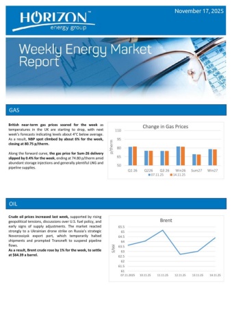 GAS OIL Crude oil prices increased last week, supported by rising geopolitical tensions, discussions over U.S. fuel policy, and early signs of supply adjustments. The market reacted strongly to a Ukrainian drone strike on Russia’s strategic Novorossiysk export port, which temporarily halted shipments and prompted Transneft to suspend pipeline flows. As a result, Brent crude rose by 1% for the week, to settle at $64.39 a barrel. November 17, 2025 50658095110Q1 26Q226Q3 26Win26Sum27Win27p/thermChange in Gas Prices07.11.2514.11.256161.56262.56363.56464.56565.507.11.202510.11.2511.11.2512.11.2513.11.2514.11.25$/bblBrent British near-term gas prices soared for the week as temperatures in the UK are starting to drop, with next week’s forecasts indicating levels about 4°C below average. As a result, NBP spot climbed by about 6% for the week, closing at 80.75 p/therm. Along the forward curve, the gas price for Sum-26 delivery slipped by 0.4% for the week, ending at 74.80 p/therm amid abundant storage injections and generally plentiful LNG and pipeline supplies.